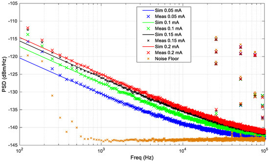The low-frequency noise spectrum measured with the set-up in Figure 13 and Figure 14 is shown in Figure 16, including the system noise floor (NF trace) and measurements for the four different current bias points: 0.05 mA, 0.1 mA, 0.15 mA, and 0.2 mA. The set-up was also simulated considering all the noise contributions and Flicker noise parameters in Equation (5), which were optimized to fit with the measurements at these four bias currents. In Table 5, the optimized parameters are listed.
