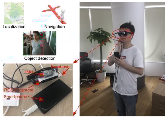 With the aim of addressing the above needs, this paper proposes a new design that incorporates navigation and recognition capabilities into a single prototype (see Figure 1). The device is based on computer-vision technologies due to the vision sensor’s characteristic of adequate information, light weight, and low cost compared to other sensors, such as ultrasonic and LiDAR sensors [] that many early assistive devices used. The components of this device include a consumer Red, Green, Blue, and Depth (RGB-D) camera attached to a pair of eyeglasses, an Inertial Measurement Unit (IMU) attached to a camera, a smartphone, and an earphone for commands/feedback. The system can work in both indoor and outdoor environments. As soon as the device is powered on, the navigation module will work to instruct the VIP whenever he/she wants to go to a place. To avoid information overload, the recognition module is activated according to the user requirement via a simple action of double-tapping the smartphone screen. The prototype was implemented and tested in both indoor and outdoor environments, and the results show good performance in terms of both navigation and recognition efficiency, and provides a good traveling experience for VIPs.