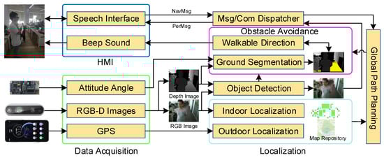 The system architecture is shown in Figure 2, consisting of six modules: data acquisition, localization, global path planning, obstacle avoidance, object detection, and human–machine interaction (HMI). The system has two main capabilities: navigation and recognition. The former works online and guides the VIP from the current location to the desired destination in both indoor and outdoor environments, while avoiding obstacles; however, the latter works on demand, e.g., when the VIP wants to find a seat or when some obstacles block his/her way. The inputs of the system include: