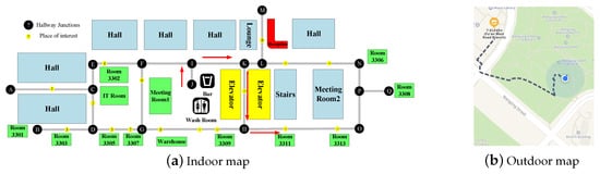 - A map repository including the indoor maps built by the Visual Simultaneous Localization and Mapping (VSLAM) technique [,] and outdoor maps provided by QQMap [].