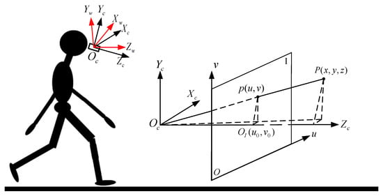 where K is the camera intrinsic parameter matrix, point is the reconstructed point in the world coordinate system, is the camera pitch angle, and is the camera roll angle.