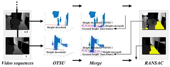 Secondly, the coarse ground is fitted via the adaptive threshold segmentation method OTSU [] and RANSAC algorithm []. As shown in Figure 5, the initial ground height threshold is calculated adaptively using the OTSU algorithm in the current frame. Since the change of ground height in two adjacent frames is usually limited, the ground height of the previous frame is used to reduce the perturbation of other planes (e.g., desk, sofa). The final ground height threshold is computed as: