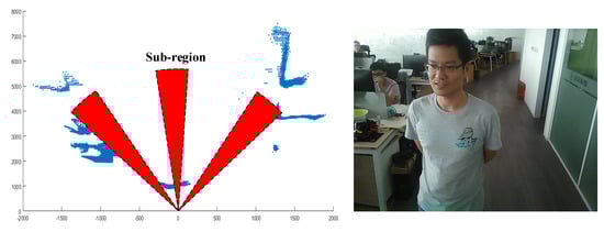 Then the 3-D points P are projected onto the plane (see Figure 6). The nearest points in all sectors (each sector is represented as the sub-region in Figure 6 and the angle of each sub-region is 0.5) can be easily obtained. The cost of each sector is computed as: