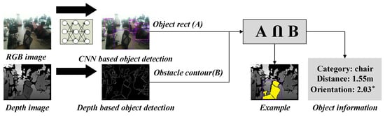 The navigation system described so far improves the mobility of the VIPs in their daily lives. However, while they can arrive at their destinations without colliding with moving or static obstacles, they still face the challenge of understanding unfamiliar environments while moving through them. A high-level situation awareness in such scenarios is crucial for the VIP to enhance their orientation abilities and safety []. The situation awareness is defined as (Level 1) perception of the elements in the environment, (Level 2) comprehension of the current situation, and (Level 3) projection of future status []. Perception provides an awareness of situational elements (objects, people, and systems) and their current status (locations, conditions, modes, and actions). Comprehension provides an understanding of the overall meaning of the perceived elements—how they fit together as a whole, what kind of situation it is, what it means in terms of one’s mission goals. Projection provides an awareness of the likely evolution of the situation, its possible/probable future states, and events []. In order to achieve the first level of situation awareness, i.e., perception, we design an object-recognition system that allows the VIP to get full awareness about the characteristics of the objects encountered along his/her way, such as the category, location, and orientation. The proposed system consists of two modules: CNN-based 2-D object detection and depth-based object detection, which are detailed in the following sections.