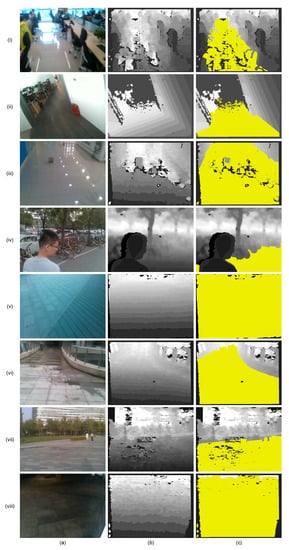 A new obstacle detection method in a Deformable Grid (DG) structure was proposed in [,] to aid VIP. It detects an obstacle in danger of a crash according to the level of DG deformation. It uses an RGB camera to capture video sequences which then will be sent to a laptop for processing. The resulting signal is conveyed to the user’s earphone via Bluetooth technology. In [], a vertex deformation function was used to improve the performance of the previous work [] in terms of accuracy and processing time. However, it cannot detect obstacles that are closed to non-textured regions such as a door or a wall.
