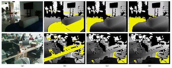where is a weight parameter. Due to the inherent limitation of the depth camera, the depth accuracy always drops down with the increase of distance. Besides, the obstacles that are too far away from the person do not need to be considered. Therefore, only the points within a threshold are used to reduce computation cost. By making use of the ground height and the distance threshold , the 3-D points for fitting the coarse ground can be obtained through: