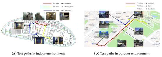 In outdoor environments, many mature services such as GoogleMap, QQMap, and BaiduMap can be used to plan a global path. To cope with the poor network or network-less scenarios, we use the QQMap service [] for its capability for working offline. An example of the planned path is shown in Figure 3b, from the office building to the 7-Eleven which is depicted by the dashed line.