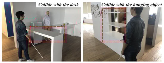 A framework called Blind Guide for VIP was proposed in [] to navigate VIP in indoor and outdoor environments by using wireless sensor networks. The system uses an RGB camera and ultrasonic sensor to detect obstacles and provide an audio signal as feedback. The system can identify chairs, tables, doors, and other objects in indoor environments via a cloud image recognition service. Thus, it only works in a scene with internet access and works well only with good light conditions.