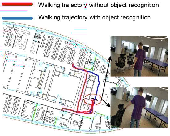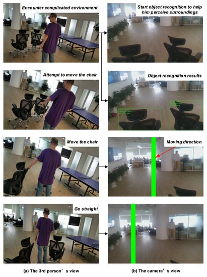 To test the effect of object recognition on the blind navigation, we design some more complicated scenarios, such as the scenario where the way is blocked by two chairs (see Figure 16) and crowded with other obstacles. With only the proposed navigation system, the user cannot follow the original shortest global path to arrive the destination, but to turn back and plan a new path to the destination (the red path in Figure 16). However, if he activates the object recognition and perceives more information about surroundings, he can move the chair and find the moving direction as shown in Figure 17. As a result, the user can continue to follow the original shortest path to the destination instead of taking more detours. This shows that object recognition can promote navigation, especially in some complicated scenarios.