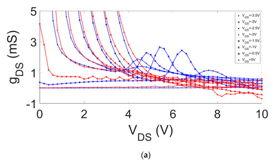 The occurrence of the self-heating can be noticed from the negative values taken on by the output conductance, as well. The related close-up view curves of gDS for both devices are presented in Figure 4.