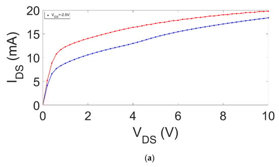 IDS versus VDS for VGS = −2.5 V measured for (a) the 100 µm HEMT and (b) the 200 µm HEMT without (blue line) and with (red line) laser exposure.