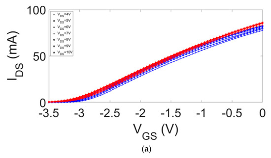 Two source measure units (SMUs) (Keithley 2611A and 2635A, Tektronix, Beaverton, OR, USA) driven by a proprietary software were connected with the on-wafer probes for tracing the DC characteristics. The employed probes had a central pin for the gate/drain terminal connection and two pins for the ground connection. Thereafter, the input SMU drove the voltage between gate and source, whereas the output SMU drove the voltage between drain and source.