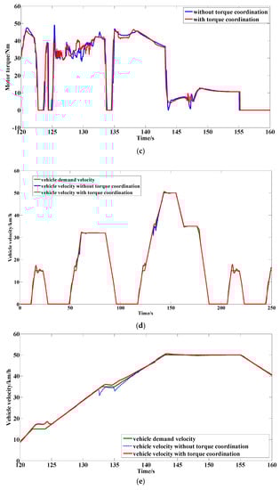 It can be seen from Figure 5a–c that compared with the method without considering the torque coordination, the fluctuations caused by the clutch torque, the engine output torque and the motor output torque are significantly reduced in the process of switching from the electric drive mode to the hybrid drive mode when considering the torque coordinated, thereby the proposed method reduced the sudden change of the torque during the switching process.
