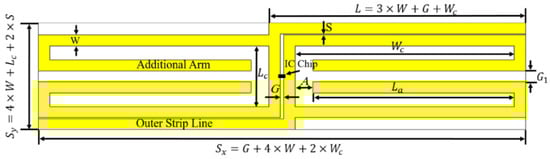 The miniature folded dipole tag antenna shown in Figure 1 is proposed for metallic objects designed for the European band. The PTFE substrate has been used to fabricate the tag antenna having dielectric constant of 2.55 ( at test frequency 10 GHz). The thickness of substrate is 1.5 mm. Symmetric C-shaped resonators with additional arms and outer strip lines have formed the proposed compact tag antenna, with the additional arms positioned inside the C-shaped resonators and connected to the resonator from one side. The upper/lower outer strip lines are aligned with the horizontal arms of the folded dipole and are connected with the left/right arm of the folded dipole, respectively. The IC chip is attached between the folded dipole () in the middle side of the layout. The width and length of C-shaped resonators are parametrically optimized to attain the final dimensions of the miniaturized tag antenna. The addition of the outer strip lines () and additional arms () to the C-shaped resonators is the key attribute to miniaturizing the size of the proposed tag antenna and attaining the optimum impedance match. The C-shaped resonators can be easily tuned to attain a match with the IC chip, forming the input impedance network. The input impedance matching is also capable of being precisely adjusted to work over any UHF region band by tuning the dimensions of the C-shaped resonators. All dimensions are as shown in Figure 1.