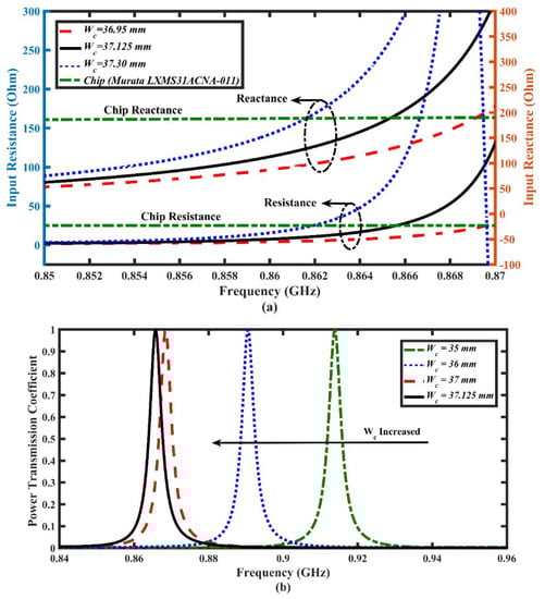(a) simulated antenna’s input impedance for different values; (b) power transmission coefficient for various values.