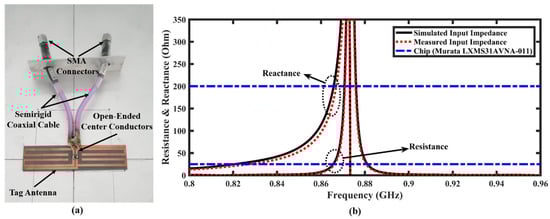 The differential probe method [33] as shown in Figure 5a is utilized to measure the tag antenna’s input impedance due to it being a practical and cheap technique. As displayed in Figure 5a, the open-ended centre-conductors of the two ports are soldered to tag the antenna on one side and the other side is connected to the vector network analyser (VNA) through SMA ports. The tag antenna’s impedance is computed by measuring S-parameters of the equivalent two-port network and using the equation , where is the coxial cable’s characteristic impedance. The tag antenna’s impedance is determined by measuring S-parameters, whereby the measured input impedance of the tag antenna is compared with that computed by the CST simulator. The results are shown in Figure 5b. The computed antenna impedance is while the measured antenna impedance is at resonance frequency of 866.5 MHz. A small discrepancy is observed between the simulated and measured tag antenna’s impedance, which may be caused by the soldering imperfection that exists between the antenna and the differential probe, or defects occurred during antenna fabrication.