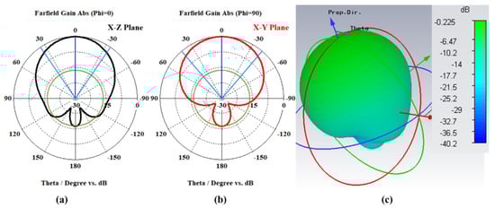 Simulated radiation pattern at resonance frequency for the miniature tag antenna; (a) X–Z plane; (b) X–Y plane; and (c) radiation pattern.