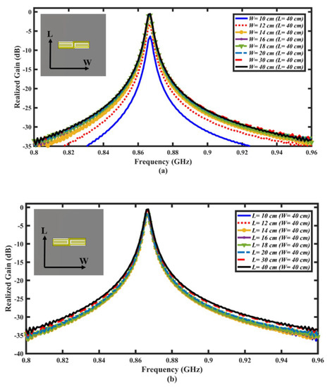 The realized gain () can be calculated by using , taking into account of the impedance mismatch between the chip and the antenna. It is considered one of the vital parameters for evaluating the miniaturized tag antenna’s performances. The results in Figure 8 show that the simulated and measured realized gain of the proposed tag antenna at the desired frequency are achieved at and , respectively. The discrepancy between the simulated and the measured results can be attributed to the mismatched losses. Changing the dimensions () of the backing metal is investigated here to see the effects on the performance of the proposed tag antenna. Firstly, the width (W) of the backing metallic surface is varied from while the length (L) is fixed at . The effect is exhibited in Figure 9a. The maximum realized gain is at the resonance frequency. Varying the length of the metallic surface exhibits similar effects on the performance of the tag antenna when L is changed from to ( is fixed). This is shown in Figure 9b. These results show that the presented tag antenna’s operating frequency is not affected with the variation of the dimensions of the metallic surface, which is preferable for metal-mountable applications of the tag antenna.