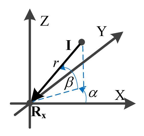 In Figure 1, I is the interferer if the interferer (base station or other terminal node) and have the LoS path, and I is the last scatterer before the arrival of the interference signal if the interferer and have no LoS path. and are the azimuth angle and elevation angle of the interference wave, respectively. is the distance from I to . is the standard deviation of the Gaussian distribution.