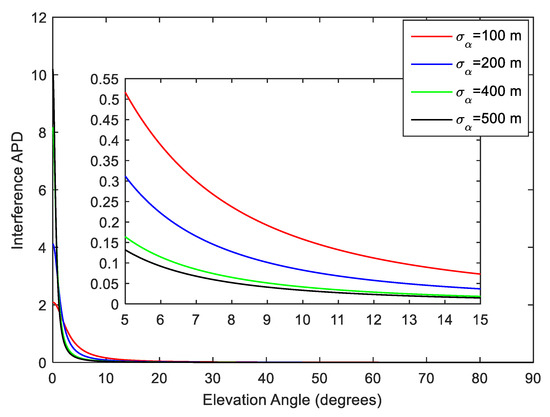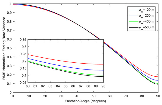 Figure 3 demonstrates the root-mean square (RMS) normalized fading rate variance of interference for different and elevation angles. For facilitating comparison with the 2D GIDM, Figure 3 uses the RMS normalized fading rate variance, which is the root-mean square of the “3D fading rate variance/2D fading rate variance”. The 2D fading rate variance can be derived as . As shown in Figure 3, as increases, the RMS normalized fading rate variance curves almost coincide in the range of (0°, 60°) of elevation. The curves differ in the range of (60°, 90°) of elevation, and moreover, the larger is, the smaller the RMS normalized fading rate variance is at the same elevation angle, but when , the curves tend to be consistent. For example, the average relative deviation of RMS normalized fading rate variances at and has been reduced to 0.8%, which also shows that the interference effects outside the horizontal distance are small. The RMS normalized fading rate variance in Figure 3 is less than or equal to one, which indicates that the received interference power fades slower for 3D GIDM than 2D GIDM. For wireless communication, the smaller interference, and the higher fading speed of interference are good for improving system performance. As shown in Figure 2 and Figure 3, the interference APD is almost zero and the RMS normalized fading rate variances are large near the elevation angle of 15°. Therefore, the elevation angle of 15° is the proper direction of antenna and beam pointing.