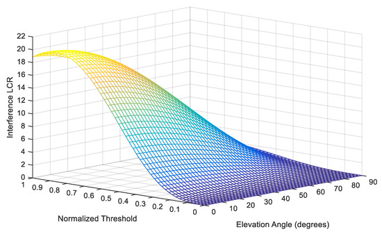 Figure 4 demonstrates the interference LCR for different normalized thresholds and elevation angles. As shown in Figure 4, the normalized threshold has a decisive effect on the interference LCR, and the elevation angle also has a significant effect on the interference LCR. As the normalized threshold increases, the interference LCR also increases rapidly. As the elevation angle increases, the interference LCR gradually decreases. When the elevation angle approaches 90°, the interference LCR decreases to almost zero, indicating that the interference fading speed becomes slower and the fluctuation also becomes smaller when approaching the vertical direction, and Figure 3 also reflects this characteristic of interference. According to Equation (21), the interference AFD is inversely proportional to the interference LCR at the same normalized interference threshold. Therefore, the variation law of the interference AFD for different normalized thresholds and elevation angles can also be obtained from Figure 4.
