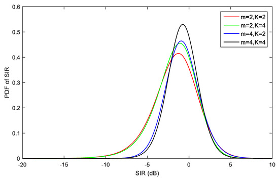 Figure 6 demonstrates the PDF of SIR for different Nakagami-m shape factor m and the Rice K-factor K. According to the Shannon formula, the channel capacity mainly depends on the SIR, which is an important indicator for measuring channel quality. Large-capacity transmission requires a high SIR. Since this paper mainly studies the variation of interference and SIR, regardless of the specific amplitude, the average power of the interference signal and the useful signal is set to . Therefore, the peaks of the PDF curves in Figure 6 are around 0 dB, and the peak position moves slightly with the change of m and K. The larger the K is, the smaller the overall fluctuation and attenuation of the multipath signal. Similarly, the larger the m is, the smaller the overall fluctuation and attenuation of the total interference at the receiver. As shown in Figure 6, the PDF of SIR is directly affected by m and K. The larger the m or K is, the more concentrated the PDF curve is, and the closer the peaks of the PDF curves are to the 0 dB. Moreover, the effects of m and K have a superposition effect.