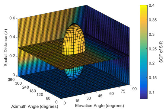 Figure 5 demonstrates the interference SCF for different spatial distances and elevation angles and whether the spatial distance or the elevation angle has a decisive effect on the interference SCF. In the range of (0°, 60°) of elevation, the effect of the spatial distance is dominant, and when the spatial distance is , the interference SCF approaches zero. However, in the range of (60°, 90°) of elevation, the effect of the elevation angle is dominant, and when the elevation angle approaches 90°, even if the spatial distance is , the interference SCF is still large. The SCF is an important indicator to measure the spatial selectivity of interference, which can guide the optimal design of the separation distance of antenna arrays. According to Figure 5, the separation distance of antenna arrays should be changed with the change of the elevation angle, that is, a small separation distance is required at low elevation angles to reduce the influence of interference correlation, and a large separation distance is required at high elevation angles. Similarly, the interference SCF is almost close to zero when near the elevation angle of 15°.