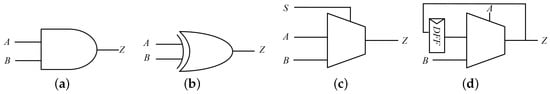 Figure 2 shows the various arithmetic operation circuits in stochastic computing: (a) shows an AND gate, which acts as a multiplier; (b) shows an XOR gate, which acts as a subtractor; (c) shows a multiplexer, which acts as a scaled adder; and (d) shows a divider with a multiplexer and a flip-flop.