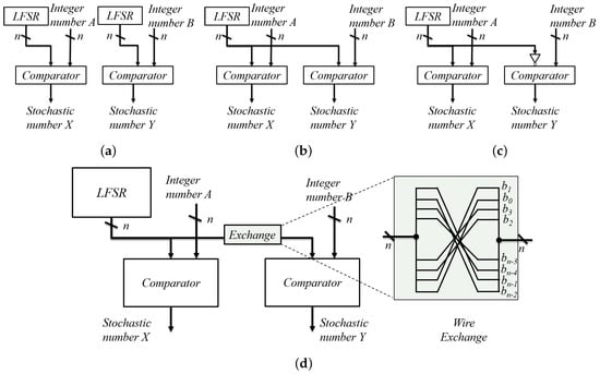 In this subsection, we explain the proposed stochastic computing method that uses a wire exchanging technique. A compact and simple LFSR is used in conventional stochastic computing. However, not all LFSR combinations can generate completely uncorrelated stochastic numbers. Therefore, in order to obtain accurate results, different random seeds are required every time for a single LFSR, or separate LFSRs are required for each input number, to generate uncorrelated stochastic numbers. The LFSR is a non-negligible module in stochastic computing and consumes a considerable amount of power since it is relatively large. In addition, if we use dedicated LFSRs for each input as shown in Figure 4a, they consume more power. Therefore, the existing methods involve sharing an LFSR, as shown in Figure 4b, or using an inverter with one LFSR when converting operands with stochastic numbers, as shown in Figure 4c. If the SNG used in the operation uses only one LFSR, the area required for the LFSR can be reduced by half. However, this leads to inaccurate results depending on the SCC that the operation is aiming at.