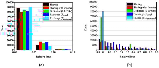 A logic-level simulation is performed using Quartus 13.1 [] in order to compare the error characteristics of the various stochastic number generation methods (with multipliers and adders) shown in Figure 4. In order to verify the computation error characteristics, 100,000 randomly generated 8-bit numbers are used. The SCC average is defined as . The absolute relative error (RE) histogram of each adder is shown in Figure 5a, and the result for the multipliers is presented in Figure 5b. The average values of the SCC and the error statistics are summarized in Table 2. The RE is defined as , where is the accurate result and is the result obtained by the stochastic computation. As shown in Figure 5 and Table 2, the SCC, RE, standard deviation (SD), and coefficient of variance (CV) are reduced significantly by the proposed design () compared with the conventional method. The SCC average for the inverting method is −0.921, which indicates a highly negative correlation. However, the SCC average for the proposed method is close to zero, which means a lower correlation. In SC adder, the proposed method provides the lower RE than inverting method and the inverting method give the minimum SD number among various SNGs. However, in SC multiplier, the proposed method gives the minimum RE, SD and CV. As shown in Table 2, the SCC is not improved by a simple exchange method (), However, the proposed method () can achieve an average SCC reduction of up to 6× compared with the sharing method during SN generation. The SD of the proposed adder is reduced by 2× compared with that of the dedicated LFSR method and the multiplier based on the proposed design can reduce the average absolute RE by more than 4× as compared with the multiplier that is driven using the inverter method.