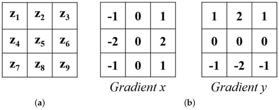 (a) 3 by 3 mask example around pixel , (b) Two Sobel masks for horizontal ( x ()) and vertical differential ( y ()), respectively.