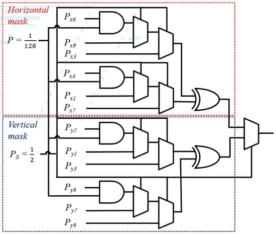 Figure 7 shows the Sobel mask design based on the proposed stochastic computing. Each P is SN for the corresponding pixel value used in the Sobel masks as shown in Figure 6b. is for the and is for the . Two results were passed through the multiplexer by the selection signal, . For mask values of ‘2’ in the z2, z4, z6, and z8 locations, those pixels are AND together with , which is the integer ‘2’ in the SN of 8 bits. Since the final mux performs the scaled addition of , the original integer value can be obtained after 1-bit left shifting. When SNs are generated, various SNGs can be used. The Sobel mask calculation, defined in the above equation, requires a total of 16 operations (e.g., additions and multiplications). Therefore, when creating each SN with a dedicated LFSR method, a total of 16 8-bit LFSRs was used. On the other hand, since the other methods (i.e., sharing the LFSR, sharing with an inverter and the proposed method) require only one LFSR for 16 SNs, one half of the inputs use the original output of the LFSR and the other half use the inverted or wire exchanged values.