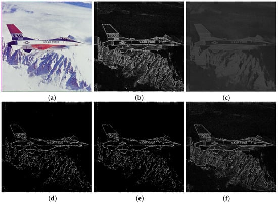 The image quality and basic design specifications (i.e., area, delay, power, and energy) were analyzed and compared between a conventional Sobel edge detection method (i.e., using accurate adders and multipliers or conventional stochastic computation) and the proposed stochastic edge detection method. The Sobel edge detection was designed with Verilog and analyzed by using a Cyclone V (5CSEMA4F31C6) FPGA device, included in a DE-1-SoC board from Terasic. In addition, the designs were synthesized using a 45-nm Nangate open cell library in Design Compiler for performance measurement in ASIC. Figure 8 shows the original image (e.g., airplane) of 512 × 512 pixels (a) and the results obtained using various edge detection methods, namely the method using accurate adders and multipliers (b), the previous methods using stochastic multiplier and adder (c, d, and e), and the proposed method (f). As shown, the image obtained using the proposed stochastic computing technique is better than the other stochastic methods and is similar to the image obtained by the accurate edge detection. Table 4 summarizes the design characteristics and noise metrics after synthesis of the Sobel edge detection technique using an accurate arithmetic operation and various stochastic computing methods including the proposed design. As shown, up to 64% of total area and 96% of power were saved in ASIC compared with the accurate edge detection. When compared with the dedicated LFSR based stochastic edge detection, the proposed method can achieve up to 55% reduction in the area, 76% reduction in dynamic power in the 45-nm-Nangate implementation. Also, it can reduce 15% delay compared with the sharing methods. In addition, compared with the accurate design, the proposed design required 50% less logic utilization, consumed up to 75% less power, and was 2.4× faster in FGPA implementation. Compared with the dedicated LFSR based stochastic computing, up to 58% of the power and 67% of the register can be reduced by the proposed design. Compared with the accurate edge detection, the root-mean-square error (RMSE) and the relative power signal noise ratio (PSNR) of the proposed design were 39.48 and 15.13 on average for the five sample images, respectively. The percentage difference between the images of the proposed stochastic Sobel edge detection with respect to the image after accurate Sobel edge detection was 11.45% on average, which is the lowest among stochastic computing methods. Also, the proposed design can reduce RMSE by 26%, enhance PSNR by 21%, and decrease the percentage difference between the images by 30% compared with the sharing method.