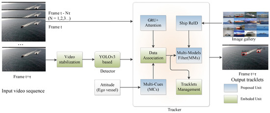 The significant contributions of this paper can be summarized, as follows. Firstly, we propose a multimodel (MM) filter approach that is based on a gated recurrent unit with attention (GRU-attention) mechanism. The maneuverability of the surrounding vessel is predicted by using the GRU recurrent neural network, being driven by the time series of the historical state of the target vessels. Secondly, a multicue (MC) data association method that considers the long-term and short-term cues is presented. Thirdly, treating the tracking by detection of maritime vessels as a typical problem of monitoring a moving object from video images captured by a moving camera [5], we propose a ship re-identification (Ship-ReID) method, which uses metric learning to determine whether the same ship is in the incoming video frame. We are the first to introduce GRU-attention for surrounding vessel maneuver prediction, to the best of our knowledge. This paper is also the first to introduce Ship-ReID to solve the identity switches (IDS) problem that is caused by camera motion, appearance variation, occlusion, and even blur in the process of maritime vessel detection and tracking.