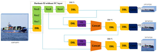 We devised a maritime vessel detector based on YOLOv3. YOLOv3 is one of the state-of-the-art CNN-based generic object detectors, and it treats the detection and classification of targets as a regression problem [11]. By regressing the location of the detected objects and performing classification, the bounding box and class of the objects are obtained by looking at each video frame only once. It can conduct three different scale predictions. When feeding into a 608 × 608 pixel image, the detection is performed using the scales of 19 × 19, 38 × 38, and 76 × 76, respectively. The structure of the detector is shown in the Figure 2.