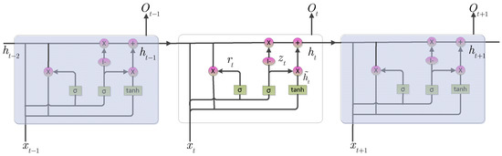 where is the input vector at time t, represents the activation function, are the weight matrix, represents the hidden activation value at the previous moment, and is the deviation vector. The activation value and the candidate activation value of the hidden node at time t are calculated, as follows, where indicates the element-wise multiplication: