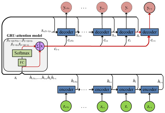 The improved framework of the GRU encoder–decoder with attention. The attention model was embedded between encoders and decoders and learned the attention weights via the fully-connected network (FC) and softmax with loss function, output vector of encoder , and state vector of decoder as the attention model’s input sequence.