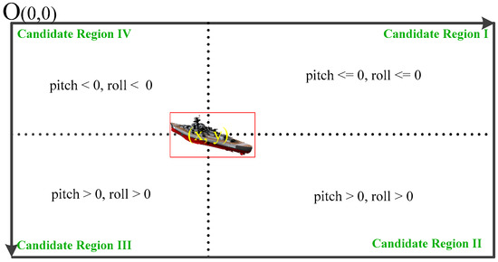 When the target vessel moves closer to the camera, the bounding box of imaging area gradually becomes larger and vice versa. Suppose that the bounding box center of the current target vessel is at (x, y) coordinate of the image, x and y divide the whole image into four quadrants, and each quadrant is a candidate region. We present four possible situations in Figure 5, while considering the pitching and rolling attitude of the ego vessel at the present moment.