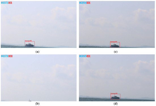 Visual tracking results of video sequence (MVI_0799_VIS_OB) with reappear after lost. In frame #0075 (a), a vessel has been stably tracked. Due to the rolling of the ego vessel, Passenger001 gradually disappeared from the camera scene in frame #0076 until frame #0078 (b), when it completely disappeared. Subsequently, it began to reappear in frame #0091 until frame #0094 (c), when it was completely visible. As shown in frame #0095 (d), the vessel was re-tracked steadily.