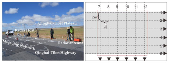 The SIR-20 GPR (GSSI, Inc.) system equipped with 200 MHz central frequency antennas was used to perform wheel survey acquisition in the test site. The measurement line layout is shown in Figure 2. Lines 1 to 6 are arranged along the direction of the road, with a line spacing of 3 meters; lines 7 to 12 are arranged perpendicular to the road, with a line spacing of 2 meters. Due to the width of the road, line 1 to 6 have 181 traces, line 7 to 12 have 101 traces. The time window of each trace is 200 ns with 512 samples. Using the measuring wheel, we use the zero offset distance measurement mode. Figure 3 shows the spatial distribution of 12 lines of data.