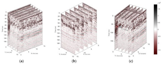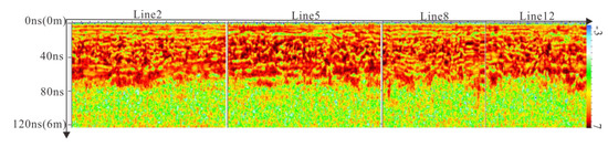 In order to ensure the quality of the data, we performed spectrum analysis and imaging capability analysis on these 12 GPR data. The data is centered at 200 MHz. In the frequency range from 0 to 500 MHz, the data energy is strong, ensuring the spectral integrity of its signal. The original data collected by the experiment uses a distance sampling mode in which the shielded antenna approximates zero offset. The amplitude data of the original data is distributed between 0–800 MHz and carries background noise pollution (Figure 4a). After noise suppression, the amplitude energy is mainly concentrated in the 50–400 MHz interval. This result is consistent with the signal characteristics of the antenna with a center frequency of 200 MHz (Figure 4b). In addition, due to the small influence from external noise and terrain interference, in order to better serve GPR data interpretation, the processing steps can be summarized as follows: correct position, background removal, frequency filtering, horizontal scaling and deconvolution.