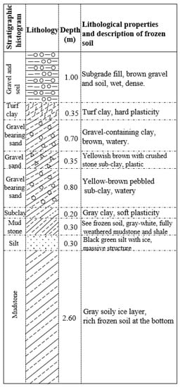 Figure 5 is a lithology and stratigraphic column of the shoulder-drilled formation in the data acquisition block. The surface layer is artificial gravel and soil filling with a thickness of 1 m. When the depth is within 7 meters, the formation lithology is mainly clay and sandstone. The lithological changes within 7 meters are mainly reflected in the size of the grain. In formations above 3.7 m depth, the melting of the frozen soil results in water in the medium. When the depth is greater than 3.7, the water content in the frozen soil is extremely low, and the water is stored in the soil in the form of ice.