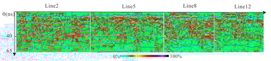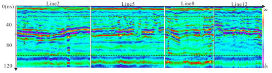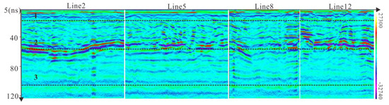 The continuity of the GPR data in phase and the strong impedance interface are often used to divide the various interfaces of the frozen soil [19]. Figure 6 shows amplitude of the 2 and 5 line which are parallel to the road’s alignment and the 8 and 12 lines which are perpendicular to the road alignment. Due to the change of the dielectric constant, a relatively reflective interface appears in the vicinity of 20 ns, 50 ns and 100 ns of the data.