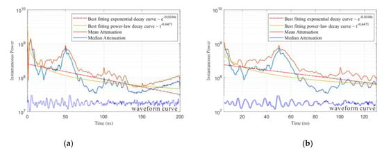 In order to more accurately determine the location of the interface, we performed waveform view and attenuation attributes analysis (Figure 7) on the data. In Figure 7, the attenuation attributes of the GPR signal are calculated. That represents the instantaneous power of electromagnetic waves over time in different media [20]. Mean and median attenuation respectively represent two calculation methods. In the calculation process, they use the mean and median instantaneous amplitude of all traces. The mean is the arithmetic average of a set of numbers, or distribution. It is the most commonly used measure of central tendency of a set of numbers. The median is described as the numeric value separating the higher half of a sample, a population, or a probability distribution, from the lower half. Two statistical algorithms can be used to avoid the incompleteness of any one algorithm, making the results more credible. This also determines best fitting models for power-law and exponential attenuation based on the median attenuation data. Among the four physical layers, the attenuation of electromagnetic waves also exhibits differences due to various values in dielectric constant, density, and water content. At time in 20 ns, 50 ns, and 100 ns, there is a significant inflection point in the instantaneous power.