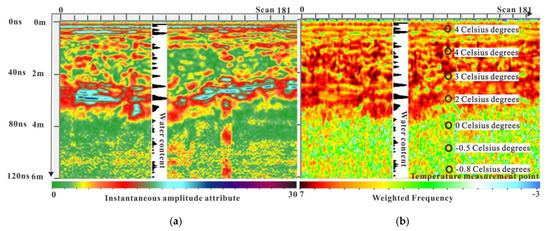 The weighted average frequency attribute is rarely affected by short wavelength and noise [23]. In Figure 9a,b, there is a high correlation between absolute instantaneous amplitude (Ai), the weighted average frequency attribute ϖ and the measured water content. The high red absolute instantaneous amplitude and weighted average frequency attribute corresponds well to the water content of the black display. On the mining of valuable attributes representing temperature, we use the correlation value greater than 65% as the reference value for attribute mining. Due to differences in media properties and particles in the surface roadbed, the correlation between temperature and water content in the surface layer is not high. The weighted average frequency attribute can basically reflect the temperature distribution characteristics of a fully melted layer with water and an incompletely melted ice layer. However, because the temperature change value is not large, the accuracy cannot reach the standard of water content correlation. So, we use this attribute to show the trend of temperature (Figure 9b). It is mainly used as a control factor for the calculation of water content. Figure 10 shows the weighted average frequency attribute reflecting the formation of temperature. Figure 10 indicates the reflecting effect of temperature in the water-ice contact. The temperature of the fully melted layer is higher than 0 ºC and the temperature of the ice-containing layer is lower than 0 ºC.