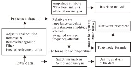 where θ is relative water content. Figure 12 shows the working methods and processes of the entire research work. The relative water content information is mined from the GPR data by calculating the value of the sensitive attribute and the relative wave impedance (Figure 11).