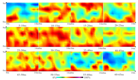 We use Equation 5 for the calculation of relative water content. Figure 12 shows the water content profile for the conversion of different line data. Because in the research of frozen soil water content calculation, the main concern area is the complete melting zone of frozen soil nodule between 20~55 (±10) ns. The measured sample data is in good agreement with the water content value calculated by the GPR data in this region. In the 50 (±10) ~100 ns and 100–120 ns areas, it is not the area of concern. The soil in this area mainly contains ice, and the measured water content is inferior to the calculated value. In addition, due to the low quality of deep data, deep data carries less physical information. We calculate and present the data within 65 ns. Figure 13 shows the planar variation characteristics of water content at different depths of time. Red represents high water content and green represents low water content. Before 10 ns, due to the roadbed medium, the surface medium was relatively dry and the water content was very low. As the depth increases, the water content in the thawing layer increases. As the depth continues to increase, the water content becomes smaller. These characteristics and values are consistent with the characteristics and measured data of seasonal permafrost ablation.