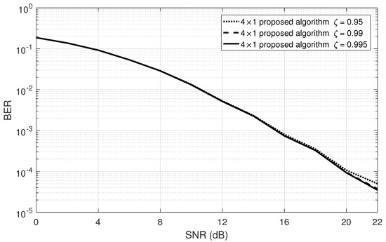 Figure 1 compares the BER performance of the proposed algorithm at various forgetting factors in a Rayleigh fading channel. As can be seen, the BER performance can change slightly according to the forgetting factor in the proposed algorithm. Thus, from the next simulation, the parameter is selected as .