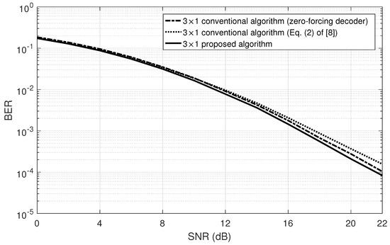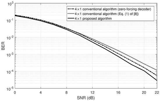 To sum up, the MMSE decoder is similar to the proposed algorithm. The main difference between the two algorithms is whether the noise variance is known or not. In other words, the MMSE decoder is not available in practical applications, because the noise variance is unknown [11]. On the other hand, the proposed algorithm can be used in real applications, because the noise variance is estimated in (12). In addition, the computational complexity of the conventional algorithm is higher than that of the proposed algorithm. The reason is that while the computation load of the conventional algorithm is 64 multiplications for the detection matrix and for matrix inversion, that of the proposed algorithm is 16 multiplications each time.