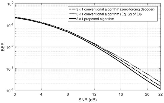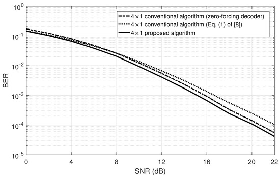 Bit-error-rate (BER) performance of the conventional quasi-orthogonal space–time block code (QO-STBC) and proposed algorithm as a function of the signal-to-noise ratio (SNR) for the four antennas system in a Rayleigh fading channel.